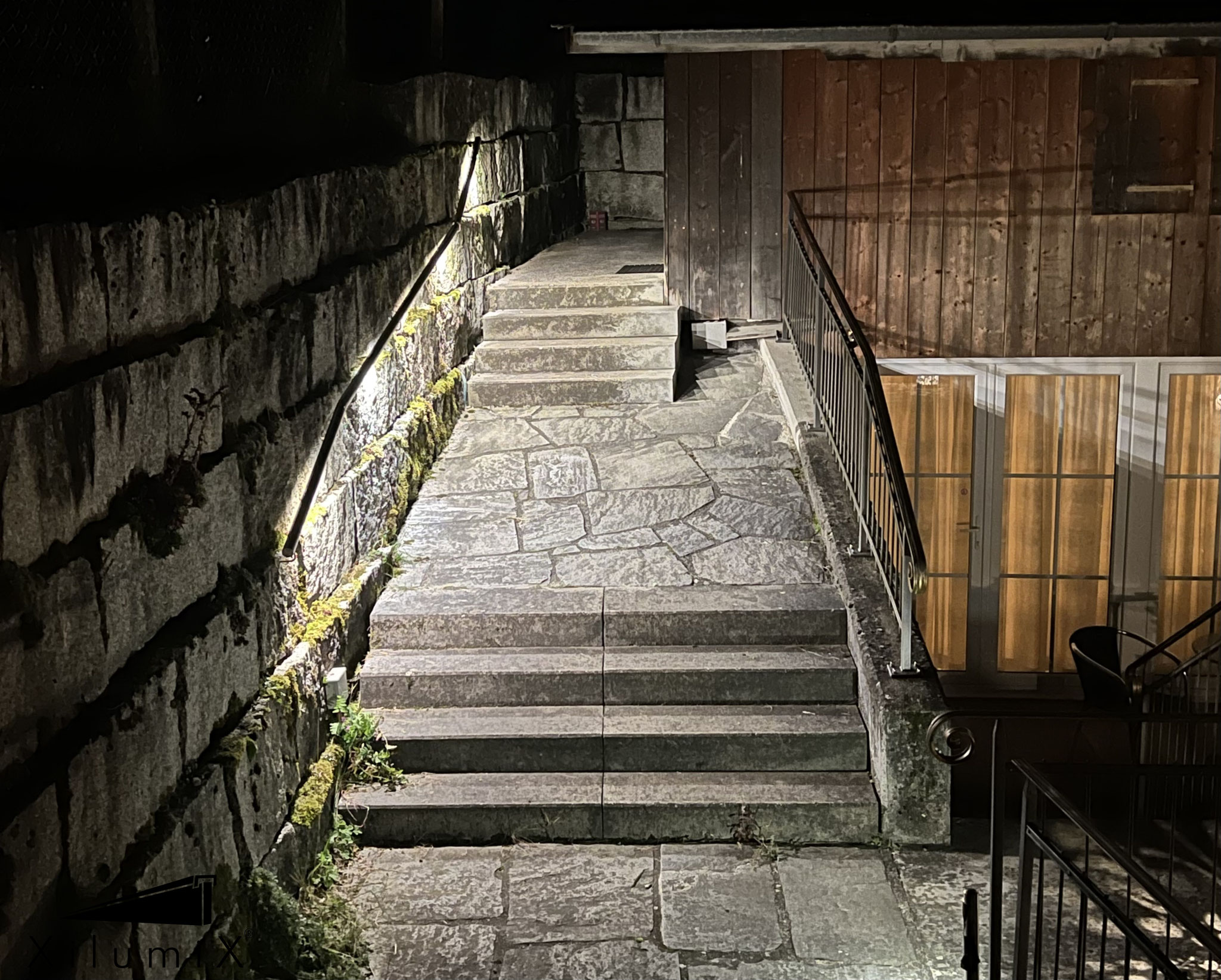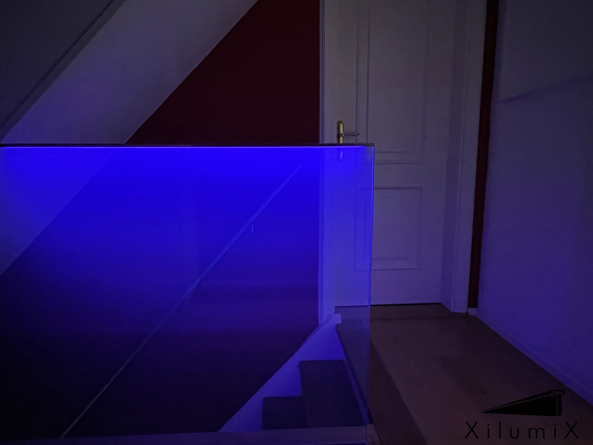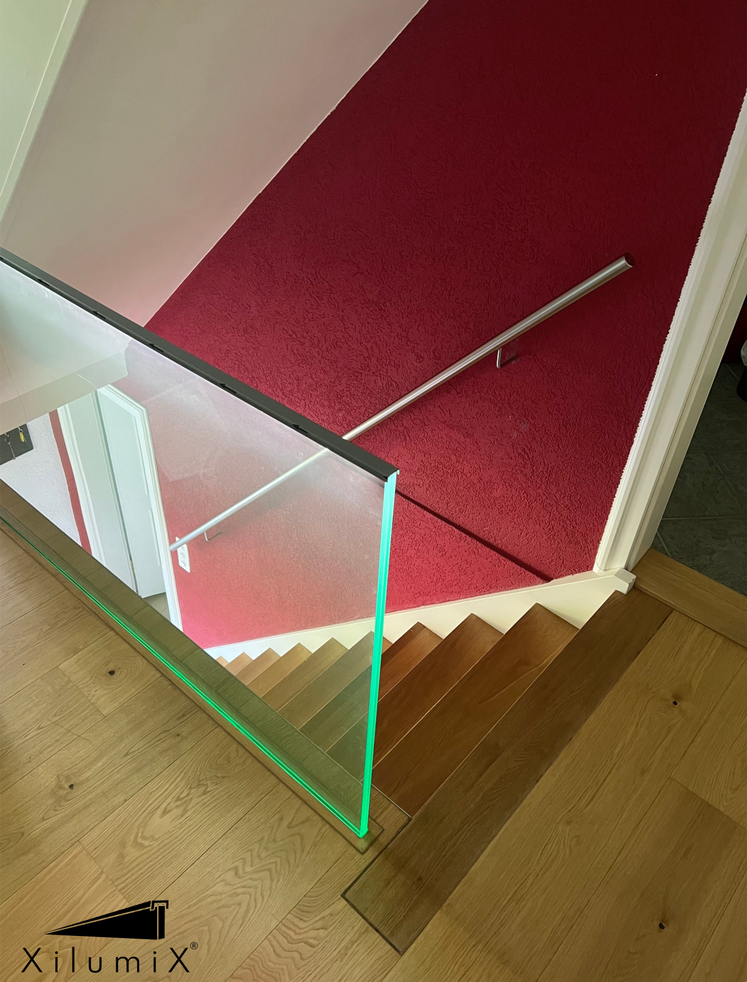 XilumiX-LED-Handlauf in einem Privatprojekt bei der Modernisierung eines Altbaus. Durch das beleuchtete Ganzglasgeländer konnte eine Aufhellung des Raumes erreicht werden, und bei Nacht wurde eine sichere Hintergrundbeleuchtung geschaffen.